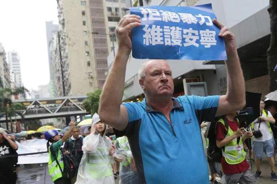 18日下午,香港反对派示威者集会队伍行至湾仔,港媒的直播镜头里出现了一个疑似“英国大爷”的身影。视频中的白人男子身穿蓝色上衣,高举着写有“拒绝暴力,维护安宁”的蓝底白字海报,走在非法示威者队伍的前面。他的斜后方就是“祸港四人帮”之一的黎智英。