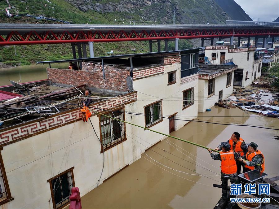 8月20日,在汶川县克枯乡下庄村,救援人员为灾民送去救生衣。 8月20日凌晨2时许,四川省阿坝州汶川县因强降雨致多个乡镇不同程度发生山洪泥石流灾害,多地道路、电力、通讯中断,造成人员伤亡。1名消防员在救援中牺牲。 新华社发(余羌 摄)